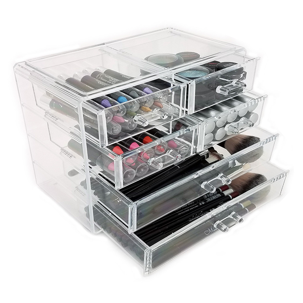 The OnDisplay Aria 6 Drawer Cosmetic/Jewelry Organizer neatly stores all your makeup or jewelry in one simple and awesome design Constructed of heavy duty molded clear polystyrene, the Aria Cosmetic/Jewelry Organizer features 6 pull out drawers for storing all your lipsticks, glosses and much more. Perfect for storing jewelry as well. The entire unit measures about 9.4" x 5.9" x 5.5".
