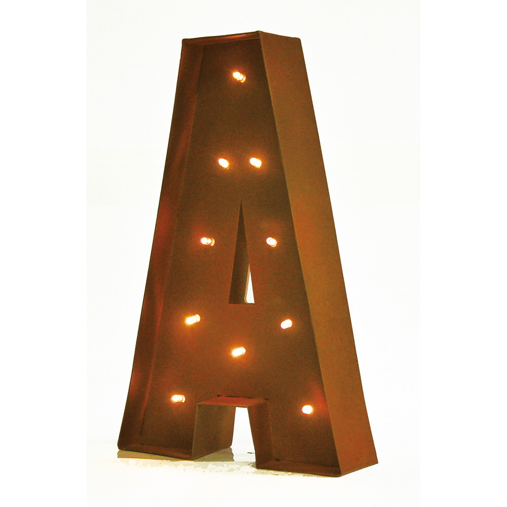 Bring modern style to your home or office with rustic, retro flair LED Glow letters. Constructed of hand hammered and shaped channel steel and finished with a rusted patina finish, each letter is embedded with an inner LED light system that will make your name pop in any room. Each letter measures 11.25" tall and 2" deep and will include a variety of bright white LEDs which are cool to the touch and last over 100,000 hours. Requires two AA batteries (not included). All letters include wall mount holes on backside. Non-curved bottom letters can stand on a tabletop.