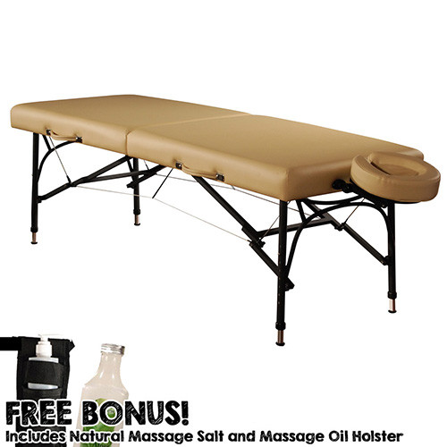 BONUS! Includes 10.5oz bottle of Royal Massage Natural Mineral Massage Scrubbing Salt and Royal Massage Single Massage Oil Holster.Highly rigid light weight aluminum alloy leg frame. Finger-joint craftsmanship reinforced11-layer plywood frame. 2.5'' thick 3-layer CloudySoft Sponge System. Environmental Skin-touch PU upholstery in 5 colors. AutoHold hinge system with incredible strength that no piano hinge can match Unsurpassed stability and EasyPush button for height adjustment. Headrest outlets on both ends. 5 year limited warranty. Package includes: Violet massage table, ErgoCaptain face cradle, Standard face cushion and standard single pocket carrying case.